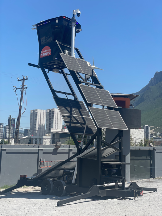 The chassis is made of steel, measuring 6 meters in length and 2.40 meters in width. It elevates up to 7 meters in height, providing the occupant with visibility of up to 9 meters to enhance perimeter surveillance and protection. It features a towing system with a ring-type hitch for up to 10,000 pounds and includes registration capability for licensing.